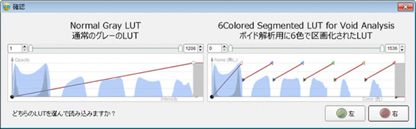 これまで上の2つの処理を行いましたが、「ボイドラベル入出力」からlblファイルを順に選び、「統合して読込む」と3種類のマテリアルが識別されたLUTになります。